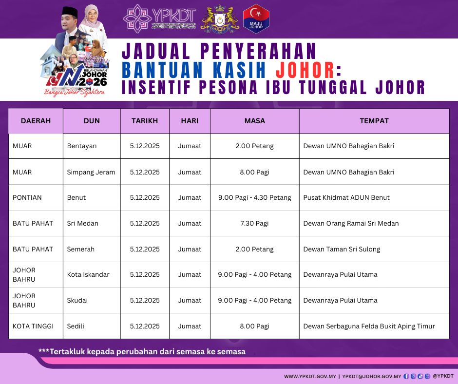 JADUAL PENYERAHAN BANTUAN KASIH JOHOR: INSENTIF PESONA IBU TUNGGAL JOHOR